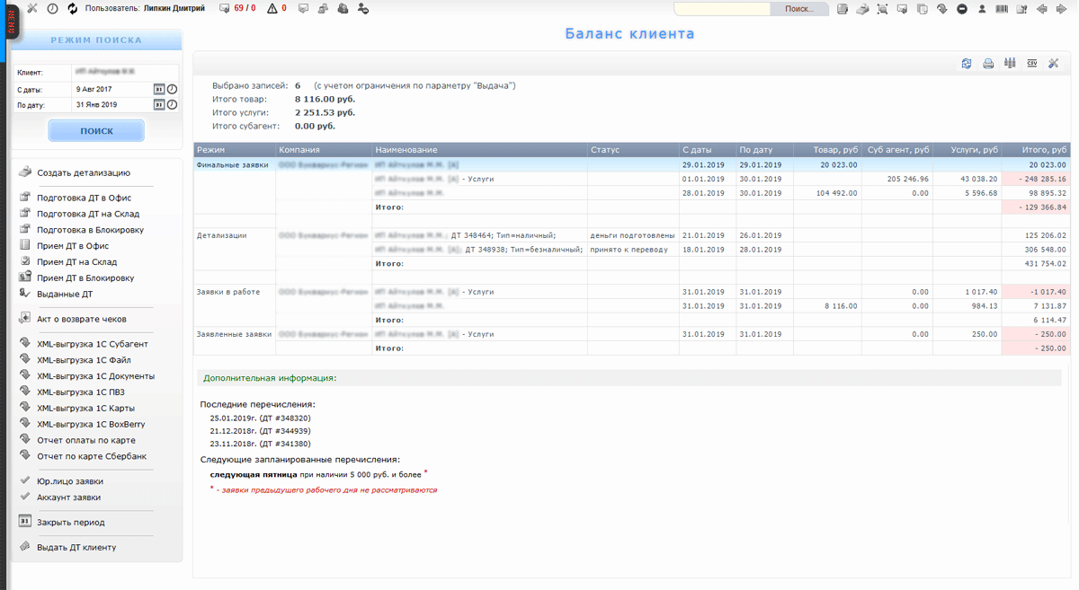Списки деталзаций финансовых обязательств с клиентами