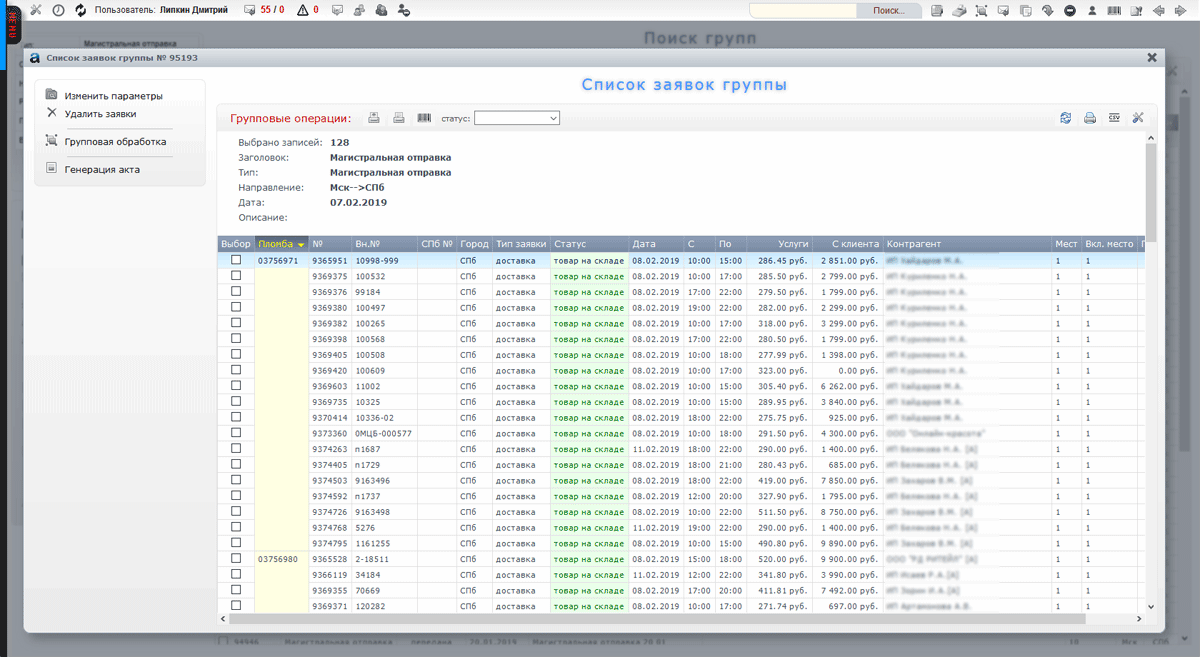 Группировка заказов для последующей магистральной отправки