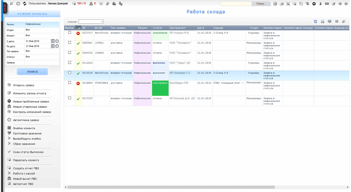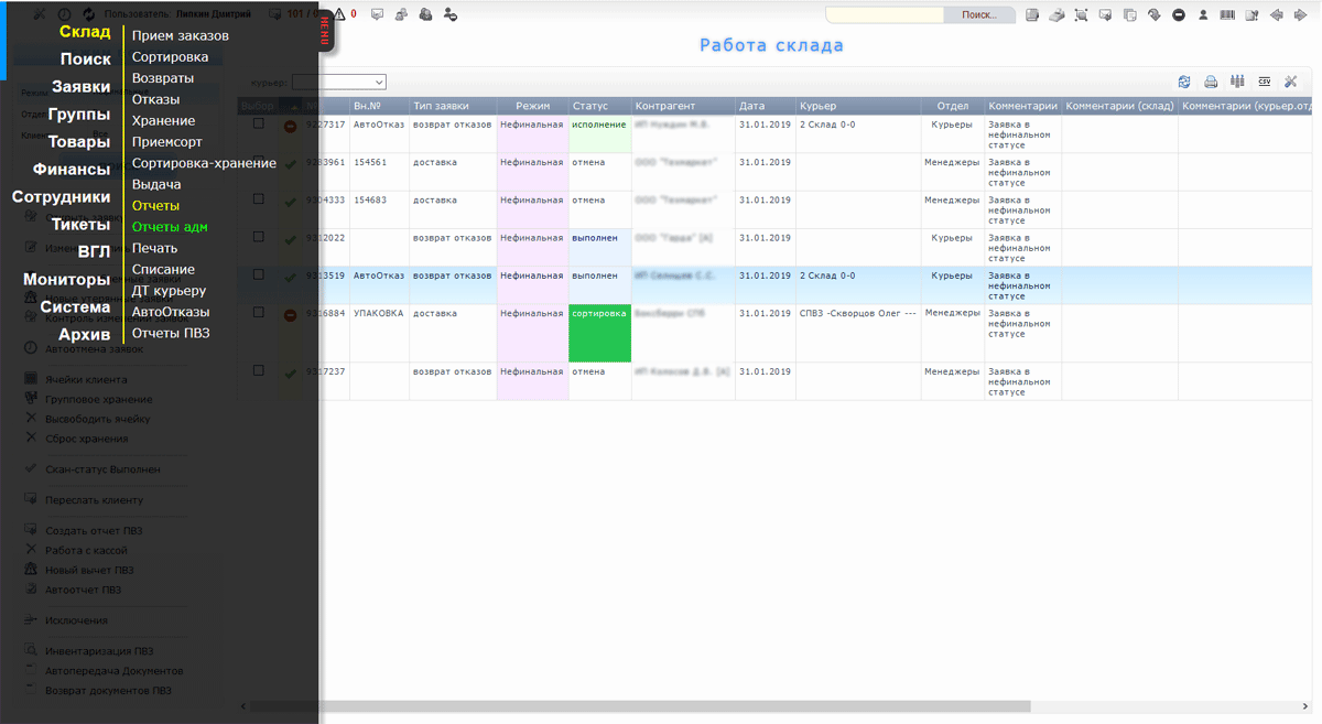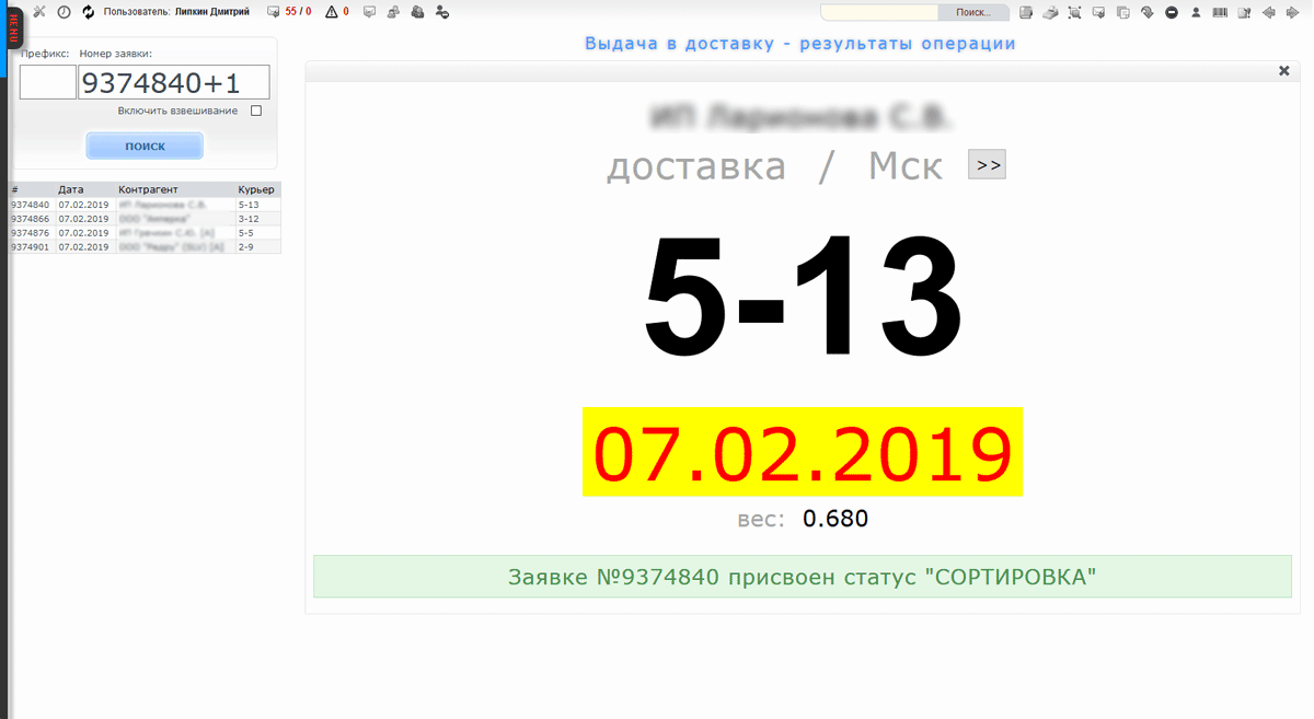 Сортировка и выдача заказа в доставку на складе