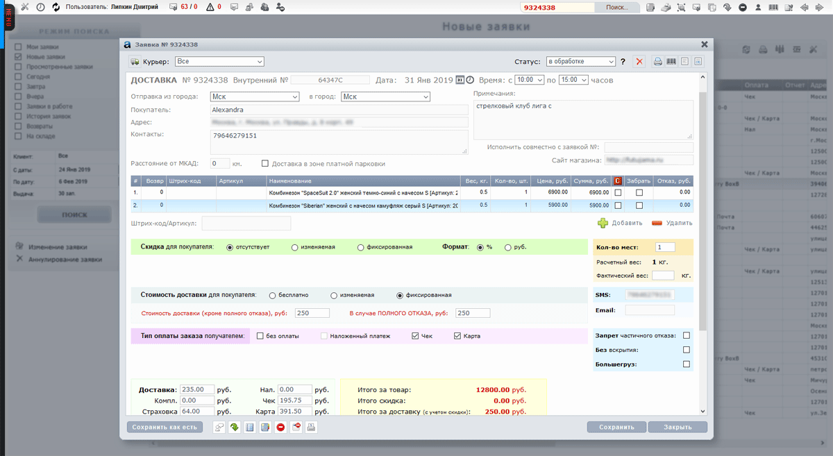 Пример формы заказа на курьерскую доставку