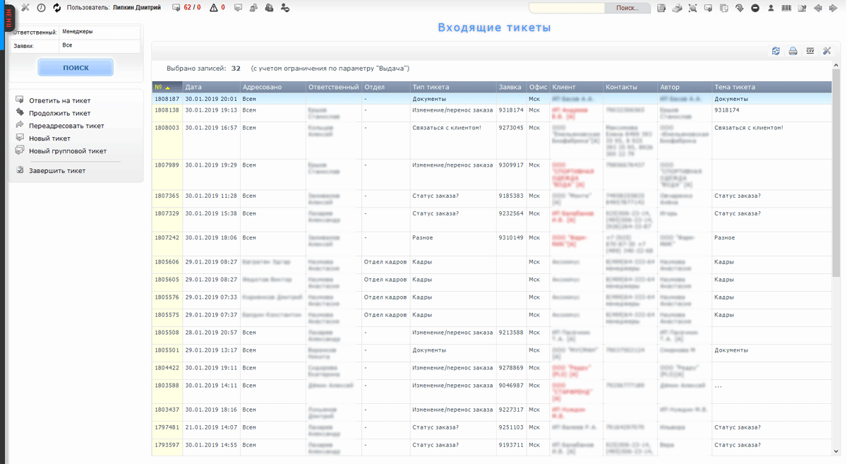 Список входящих тикетов